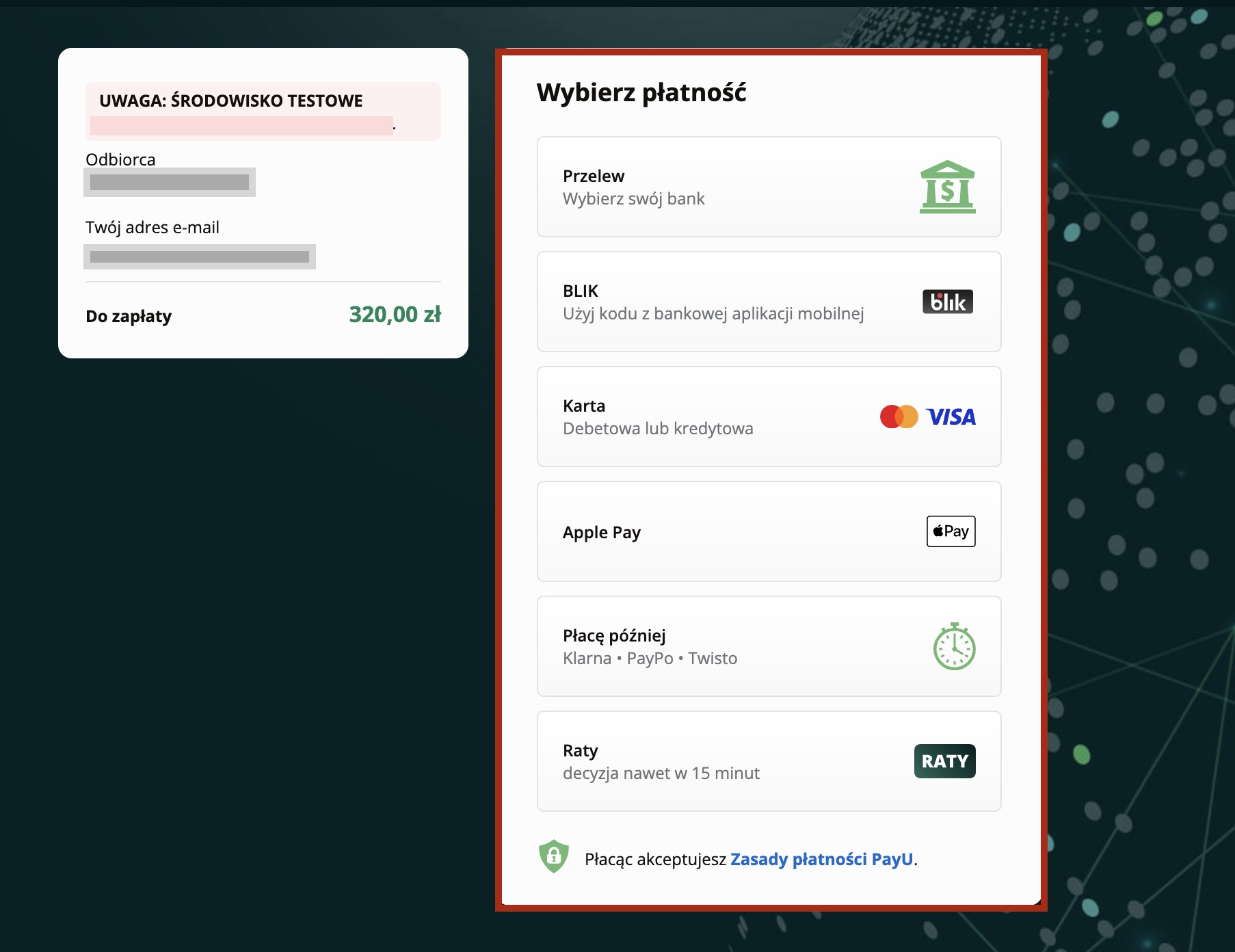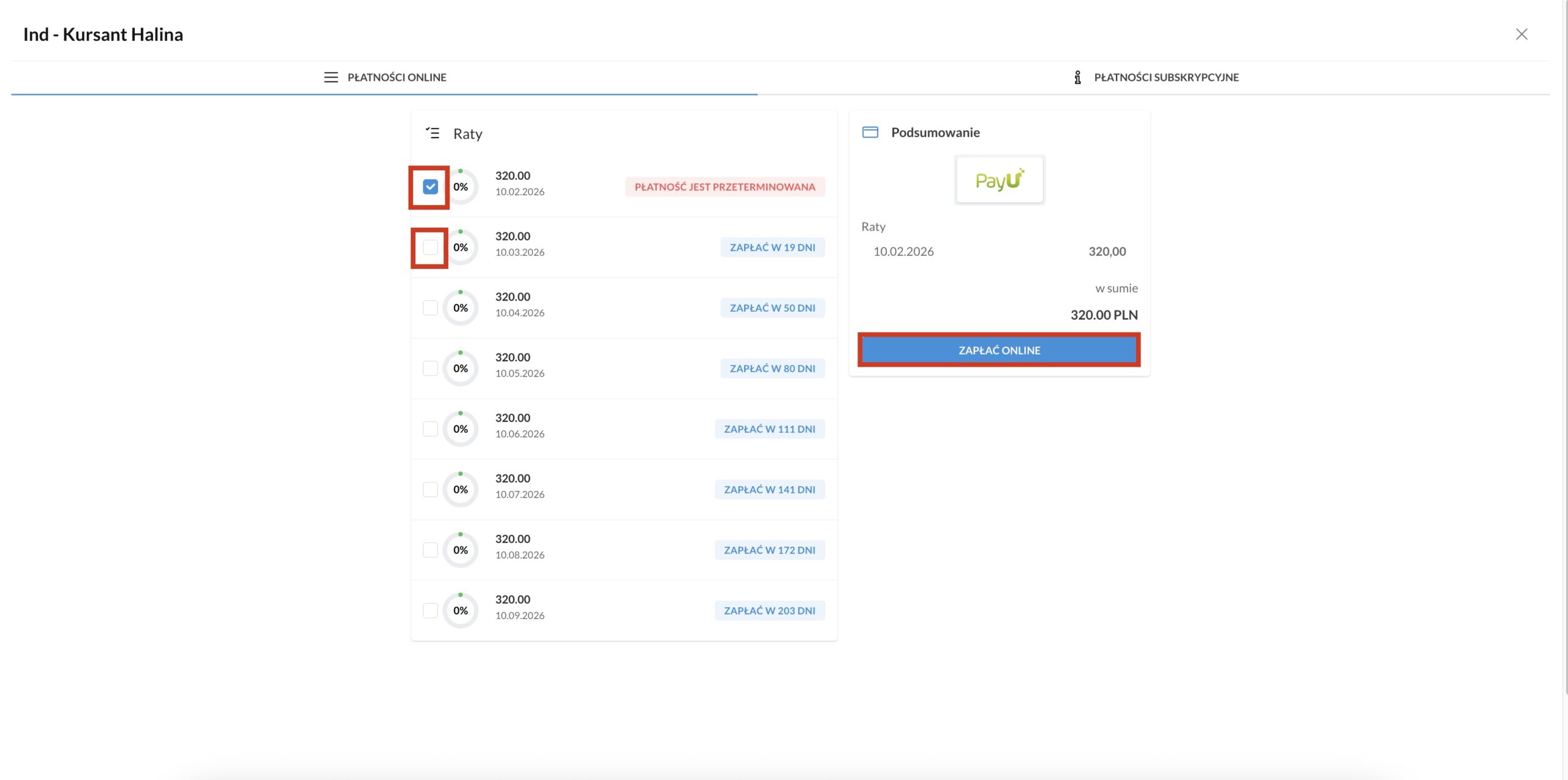 W kolejnym oknie wybierz raty które chcesz opłacić i wybierz jedną z dostępnych form płatności i potwierdź swój wybór klikając przycisk „Zapłać online”.