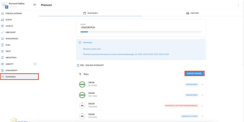 Poza tradycyjną metodą płatności, jaką jest zapłata gotówką w sekretariacie, przelewem bankowym, możesz opłacić ratę. dokonując płatności PayU. Proces przetwarzania przelewu przez PayU, jest o wiele krótszy od przelewu bankowego i od momentu wykonania przelewu do zarejestrowania wpłaty w systemie, zazwyczaj mija kilka minut.
