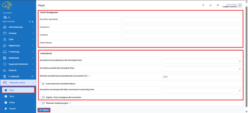 Teraz, przejdź do integracji konta z Platformą LangLion. W tym celu uzupełnij puste pola w zakładce „Płatności online” -> „PayU”: