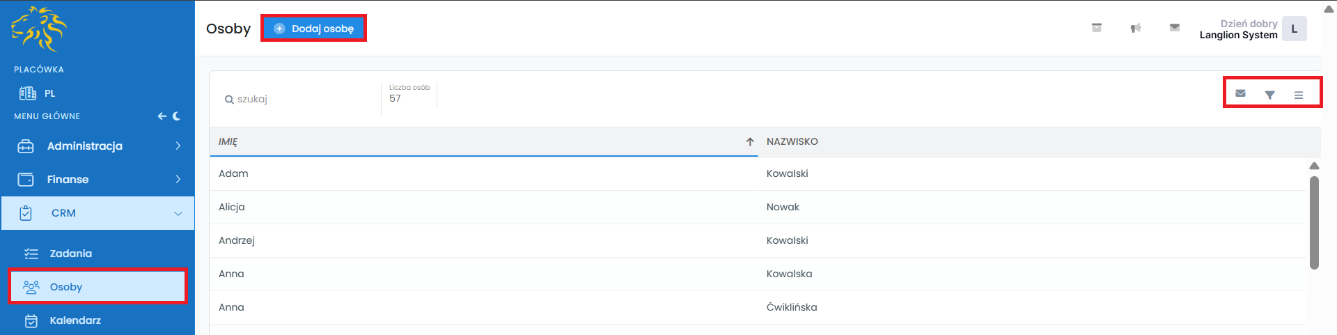 • Osoby – znajduje się tu listę osób, dodasz nową, a także przypiszesz do nich zadanie oraz notatkę. Na liście automatycznie wyświetlają się aktywni, nowi oraz zarchiwizowani kursanci, a także menedżerowie firm. W prosty sposób rozróżnisz ich na liście – każda osoba ma przypisany typ użytkownika, np. Kursant, Firma, Zarchiwizowany (ci wyświetlą się na szarym tle),