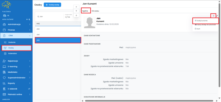 To bardzo proste. Wybierz użytkownika z listy a następnie, w zakładce „Ogólne” po prawej stronie, kliknij „Więcej” i dalej „Dodaj kursanta”. Potwierdź komunikat systemowy, który pojawi się na górze ekranu. Po zapisaniu danych, system automatycznie przeniesie Cię do zakładki „Kursanci” w Sekretariacie, abyś mógł dokończyć edycję kursanta. Od teraz użytkownik będzie wyświetlany zarówno jako kursant w module „Administracja” jak i kontakt w „CRM”.