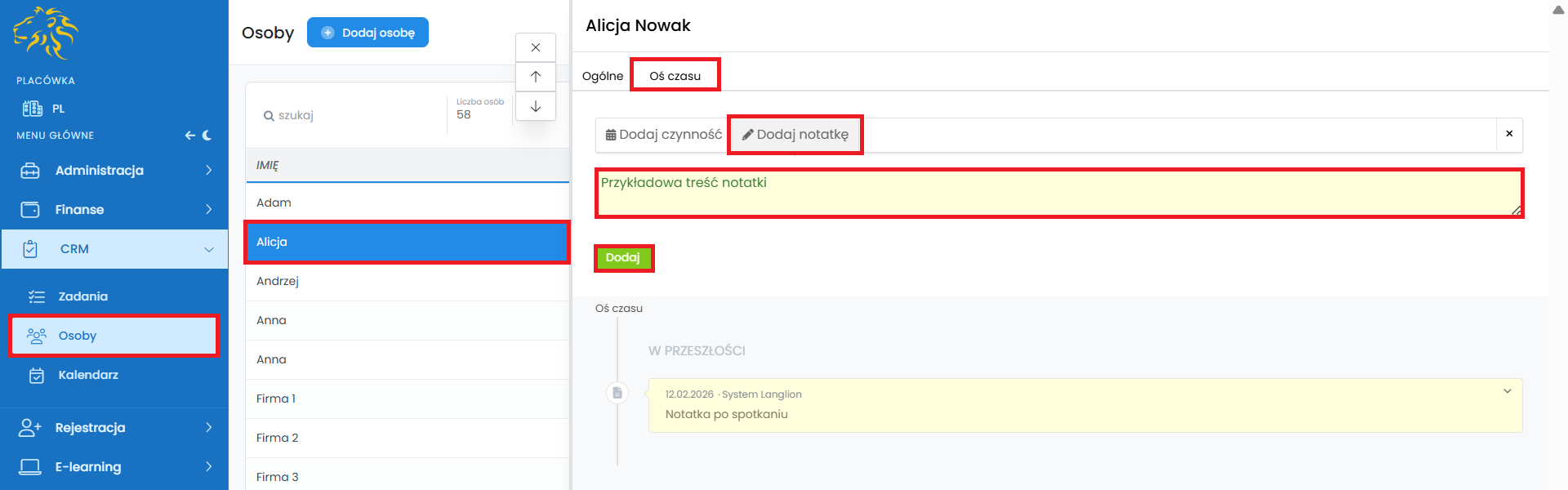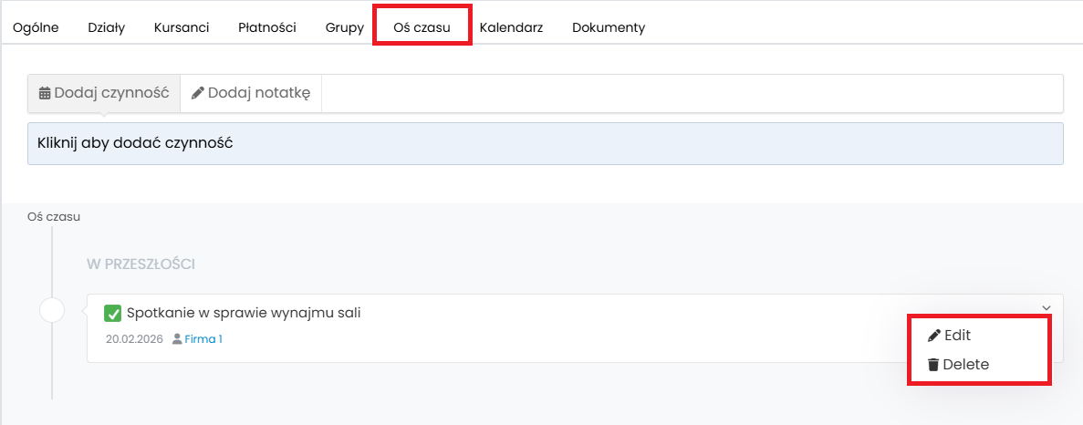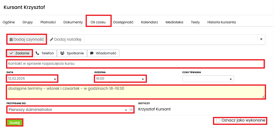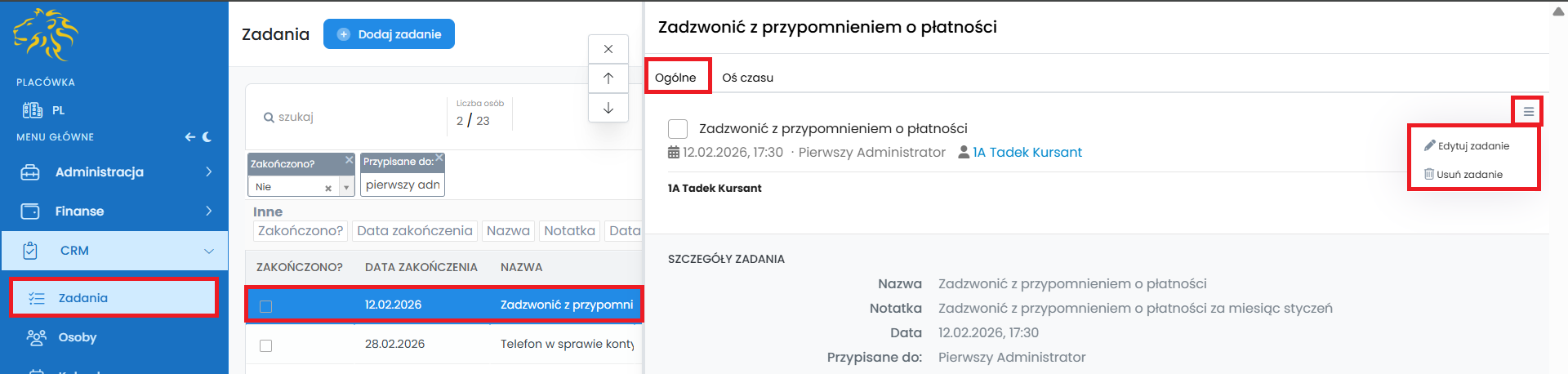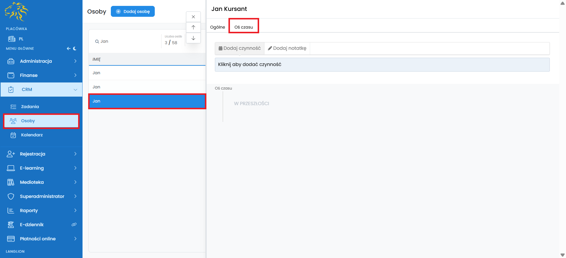 Wszystkie dodane zadania, które powiązane są z kursantami lub innymi osobami dodanymi do CRM, wyświetlą się również na ich osi czasu w zakładce „Osoby”.