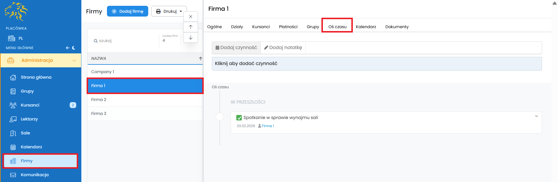 Przy włączonym module CRM, oś czasu pojawi się również przy Kursantach, Nowych kursantach i Firmach w zakładce Sekretariat. Z tego poziomu też możesz dodawać zadania i notatki.