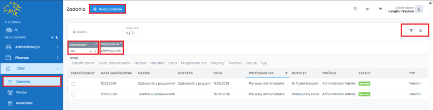 W zakładce zadania znajduje się lista wszystkich utworzonych zadań. Domyślnie nałożone są na nią filtry, przez co wyświetlają się w pierwszej kolejności zadania do realizacji i przypisane do Ciebie. Aby wyświetlić pełną listę, usuń domyślne filtry.