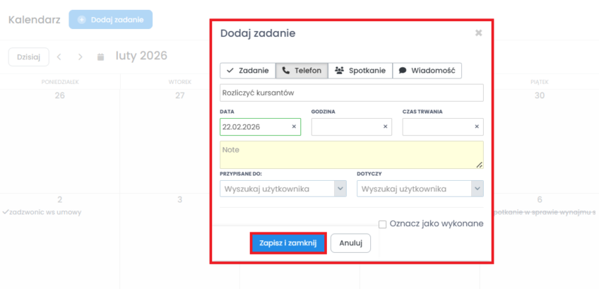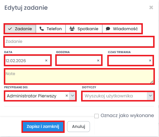 Wystarczy, że klikniesz „Dodaj zadanie” i pojawi się nowe okno, w którym uzupełnij odpowiednie pola. Są one dokładnie takie same jak w przypadku dodawania zadania z poziomu zakładki Osoby”. Kliknij „Zapisz i zamknij” aby zapisać zmiany.