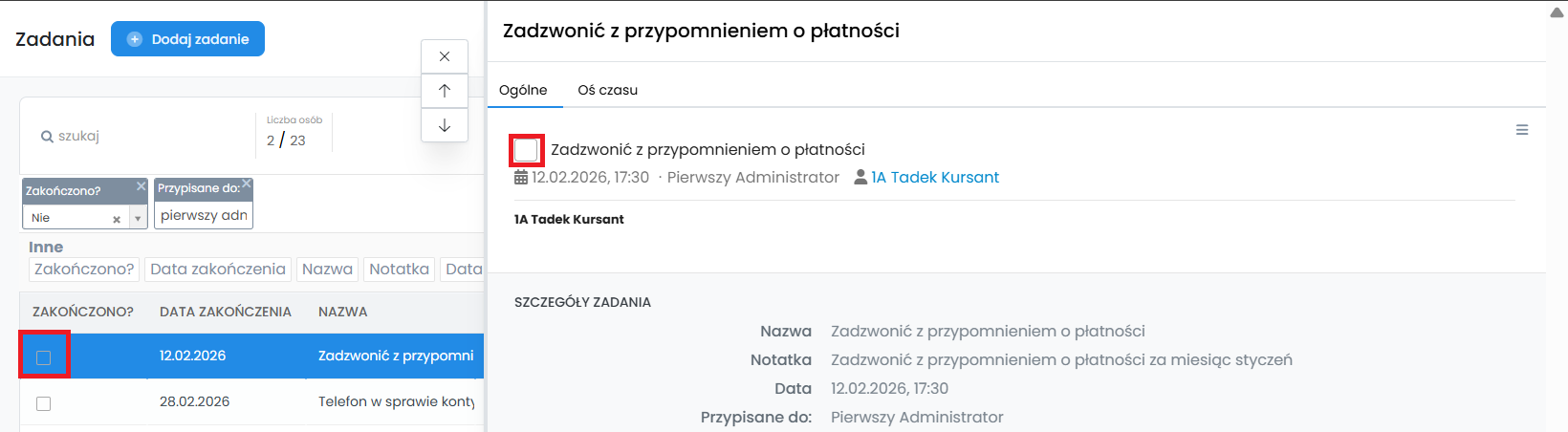 Aby oznaczyć zadanie jako zrealizowane, kliknij w kwadracik przy jego nazwie. Możesz to zrobić przy szczegółach zadania (zakładka po prawej stronie listy) lub na liście zadań w kolumnie „Zakończone”.