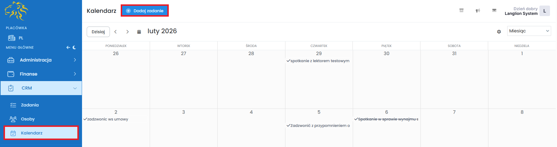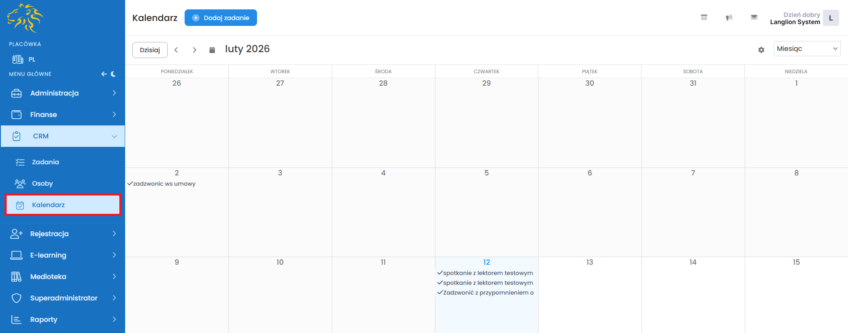 • Kalendarz – widok wszystkich zadań do zrealizowania, jak i zrealizowanych na widoku kalendarza. Z tego miejsca także możesz utworzyć nowe zadania, edytować już istniejące oraz oznaczać je jako wykonane.