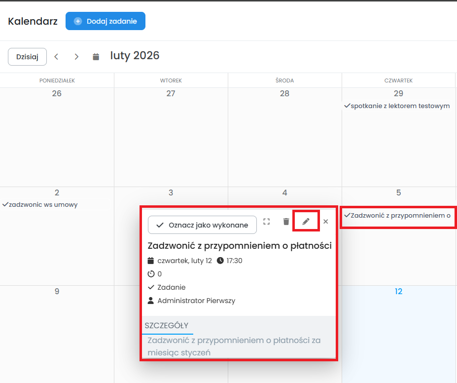 W prosty sposób możesz także edytować zadania. Wystarczy kliknąć na wybrane zadanie, a następnie na ołówek edycji. W oknie edycji wprowadź zmiany i zapisz je za pomocą przycisku „Zapisz i zamknij”.