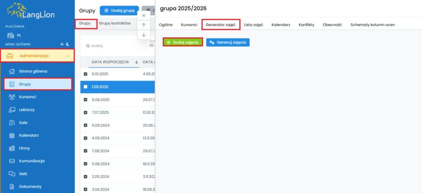 To proste, wystarczy że wybierzesz grupę, w której lektor będzie uczył. Następnie przejdź do zakładki „Generator zajęć” i kliknij w przycisk „Dodaj zajęcia”.