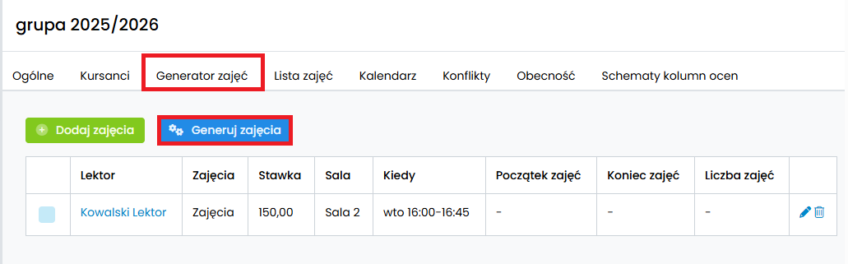 Gotowe, zajęcia z wybranym lektorem zostały dodane do grupy. Teraz, aby lektor widział swój plan i mógł zarządzać zajęciami, wygeneruj zajęcia w grupie. W tym celu, kliknij „Generuj zajęcia”.