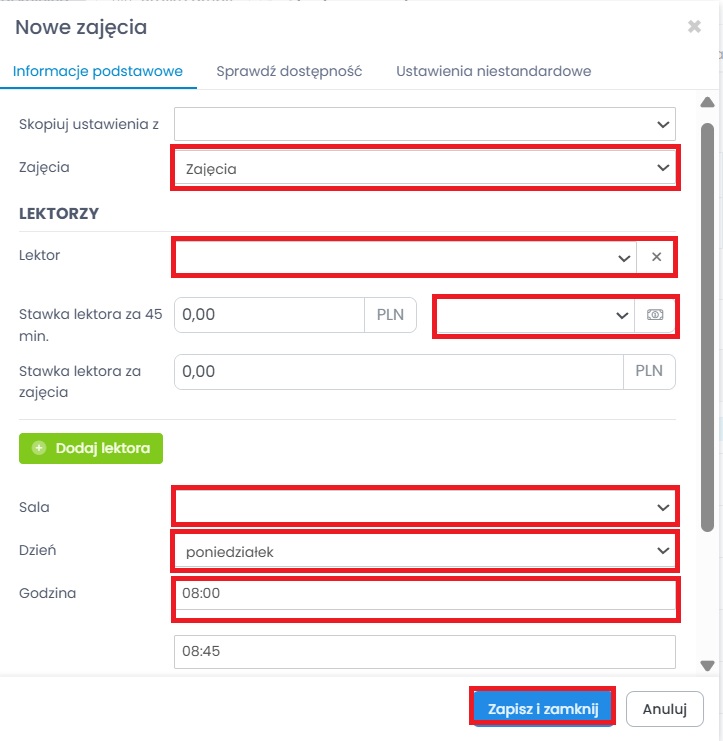 W formularzu edycji zajęć, wprowadź zajęcia, które będą odbywały się w grupie, wybierz lektora, jego stawkę, wybierz salę, ustal dzień, w który grupa będzie się spotykała na zajęciach oraz ich godzinę. Po wypełnieniu formularza edycji zajęć, zapisz zmiany.