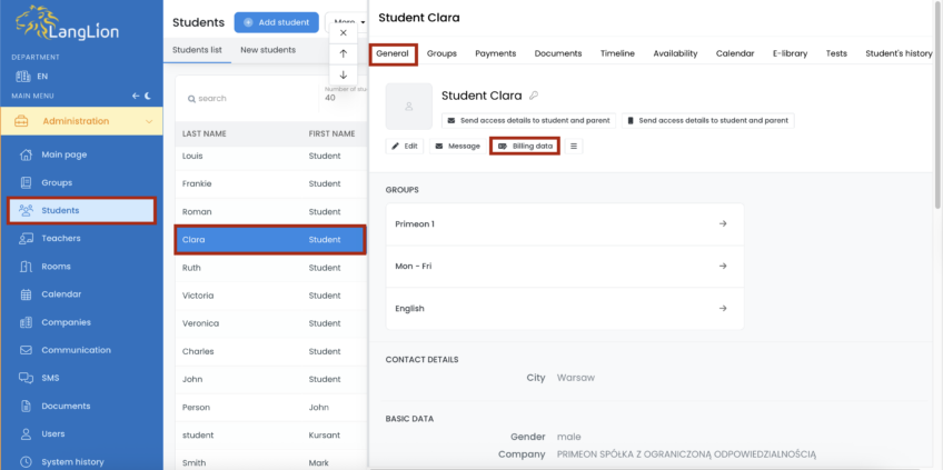 Sometimes a student asks for an invoice but with data different from this in the system, such as a different address. With the billing data option, you can separate student contact data from data that is displayed on financial documents – invoices and cash documents.