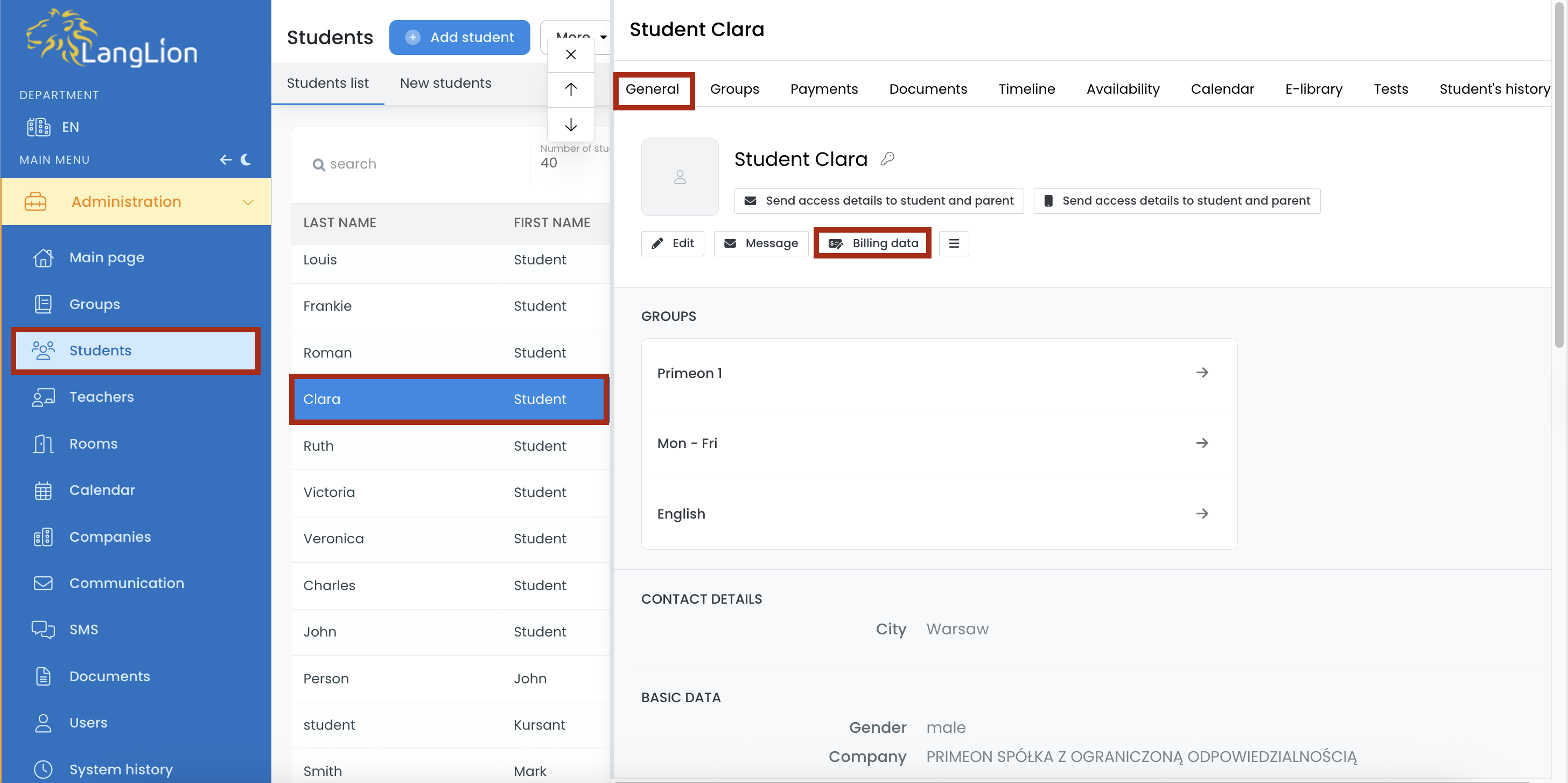 In the Administration module, choose Students tab, select a student, and in the General tab, select Billing data.