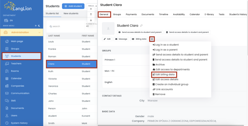 You can also edit a student’s billing data under the General tab -> More -> Edit billing data.