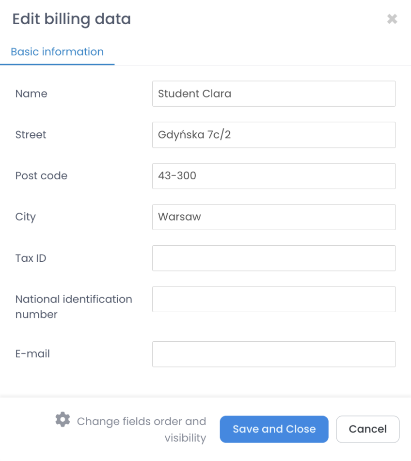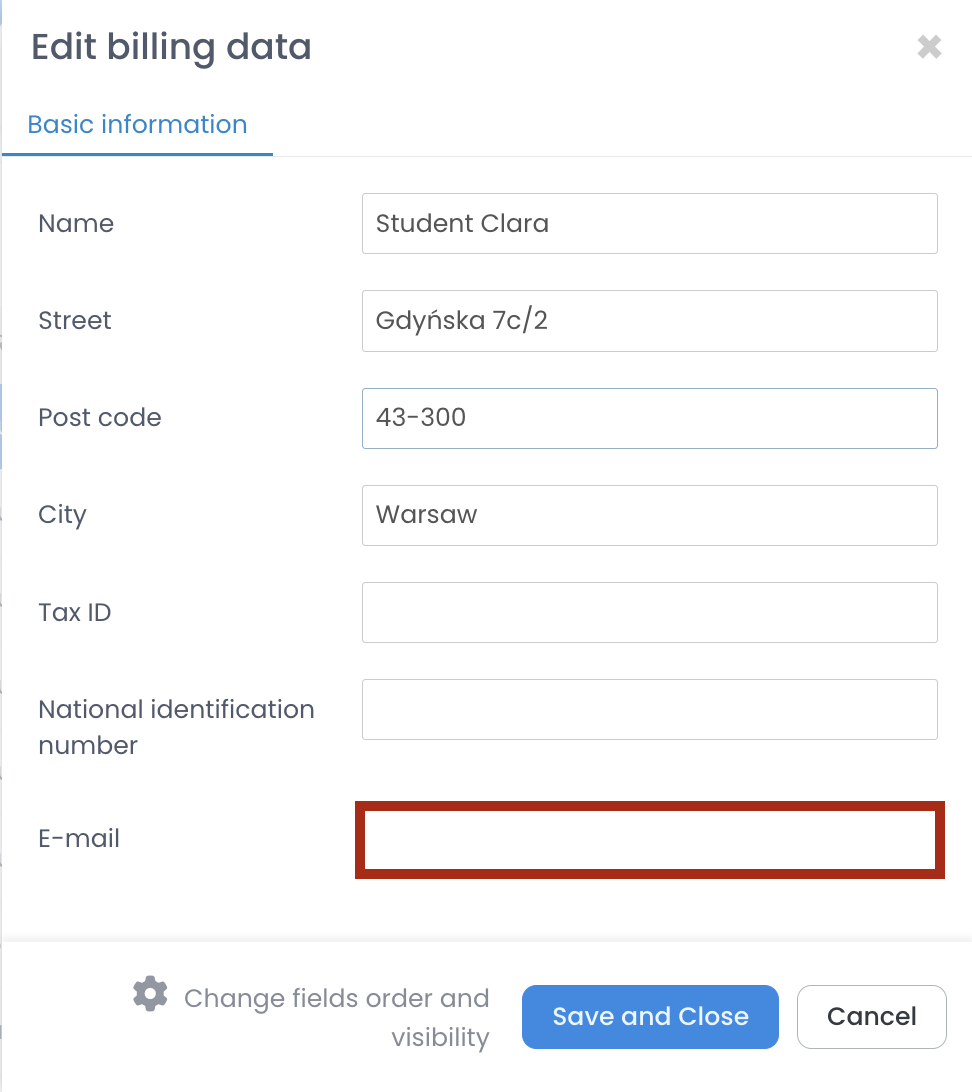 If a student wants to receive invoices to a different e-mail address than the one provided in his contact details, you can enter such an address in the billing data edition.