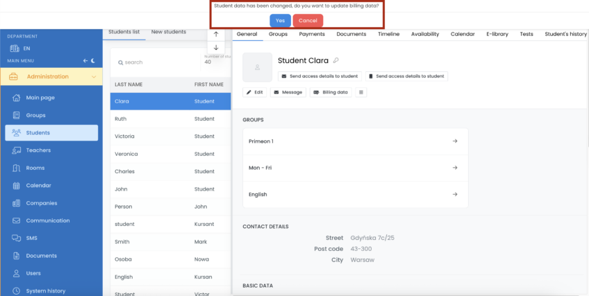 Even when you change the contact details of the student, after you save it, the system will display a message saying that the student data has been changed and will ask if you want to overwrite existing billing data with newly entered information.