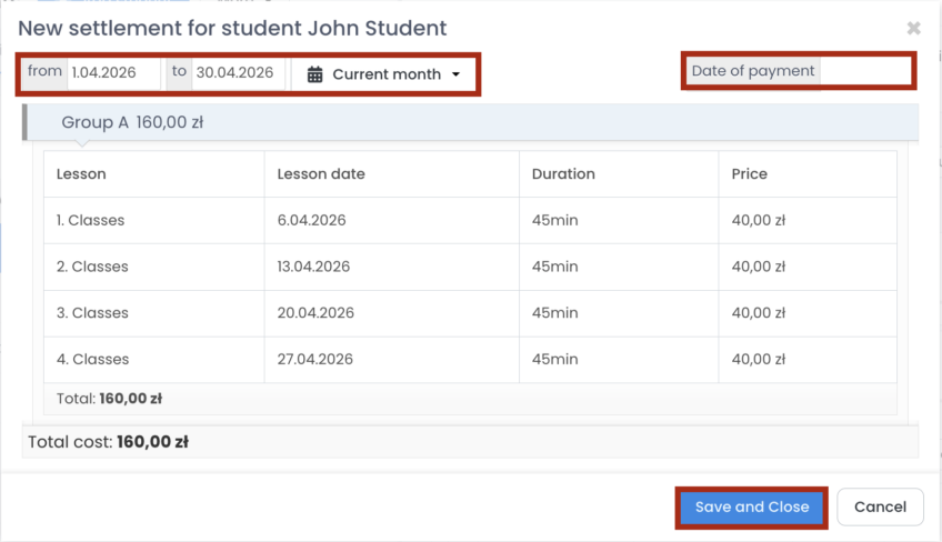 4. Select the settlement period by setting the time range. Add a payment date so that the student knows when payment is due. If you want to expand the list of lessons from a given settlement, click on the name of the group.