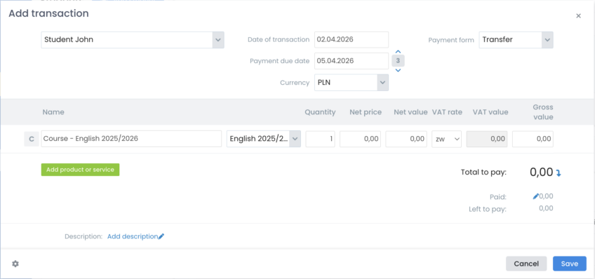 2. In the new window, select the payment method (ie., cash or transfer), select the product, and you can also add a description of the payment. The payment amount is automatically taken from the installment; however, you can enter a different amount manually.