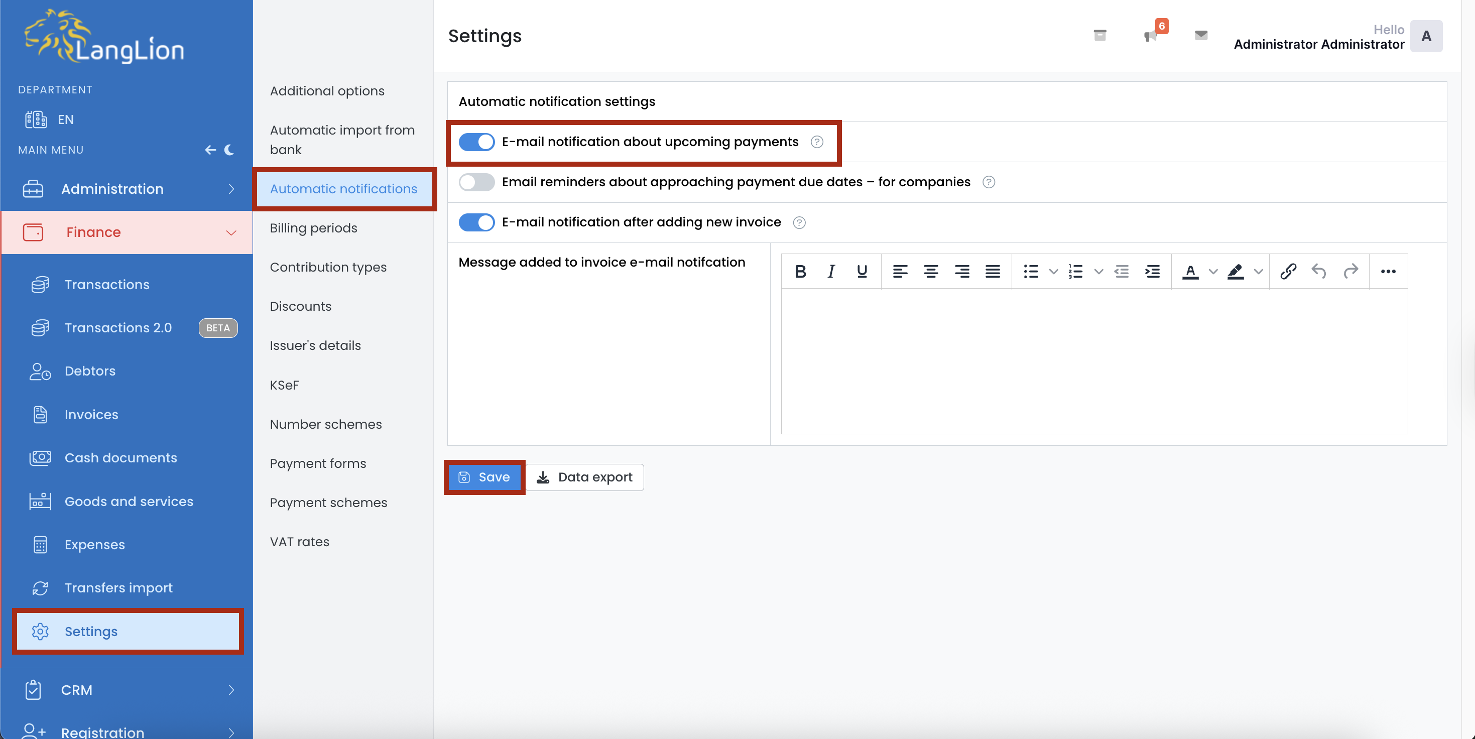 To enable this feature, go to the Settings tab in the Finance module. Then navigate to automatic notifications and select Email notification about upcoming payments. Finally, save the changes by clicking the Save button.