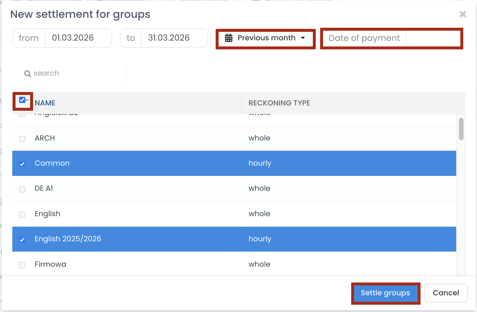 4. Select the settlement period by setting the time range. Add a payment date so that the student knows when payment is due. If you want to expand the list of lessons from a given settlement, click on the name of the group.