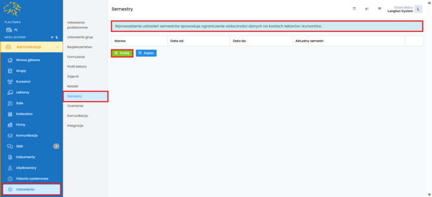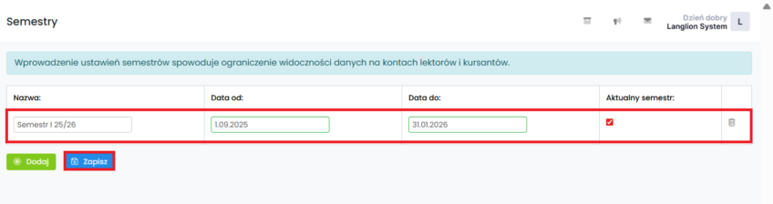 Jedną z dostępnych funkcji Platformy LangLion jest zarządzanie semestrami. Semestry są filtrami, które powodują ukrycie danych np. zajęć, nie wchodzących w ramy czasowe aktualnego semestru.