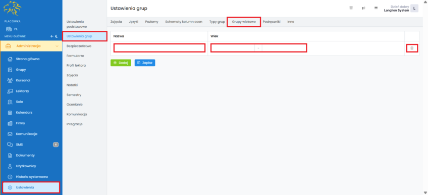 Jeżeli grupa wiekowa została blednie wprowadzona, możesz ją usunąć klikając w ikonę kosza.