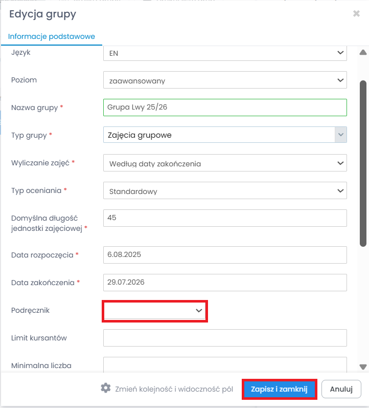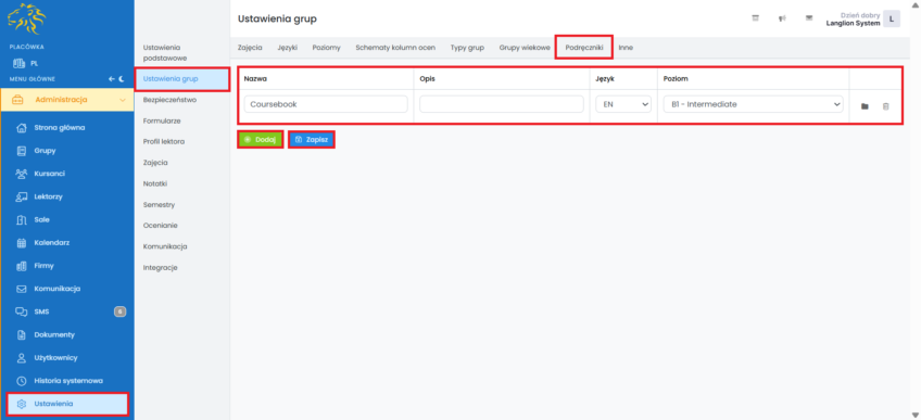 W Platformie LangLion możesz dodawać podręczniki, które następnie przypiszesz danej grupie. W dalszym zarządzaniu grupami, masz możliwość filtrowania grup według podręcznika, który do nich przypisano.