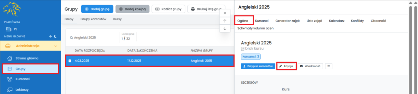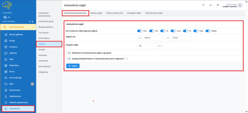 - Przejdź do modułu „Administracja” a następnie wybierz zakładkę „Zajęcia” i „Ustawienia podstawowe”