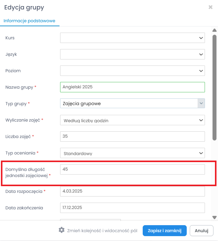 Domyślna długość jednostki zajęciowej to parametr, który wykorzystywany jest przy tworzeniu grupy. Określ długość zajęć konfigurując system, dzięki temu będzie się ona automatycznie zaciągała do formularza grupy.
