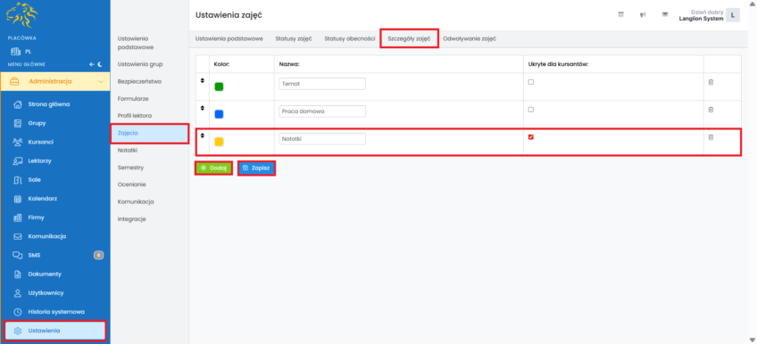 1. Z menu „Administracja” wybierz „Ustawienia” -> „Zajęcia” i przejdź do zakładki „Szczegóły zajęć”.