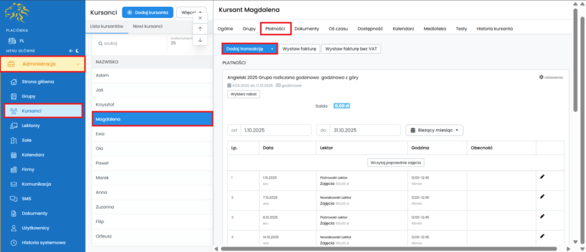 Podobnie dzieje się w przypadku opłacenia lekcji i wprowadzenia zaległych obecności przez lektora. Lekcje, na których nie było kursanta, zostaną graficznie oznaczone, a ich kwota zostanie przeniesiona do salda.