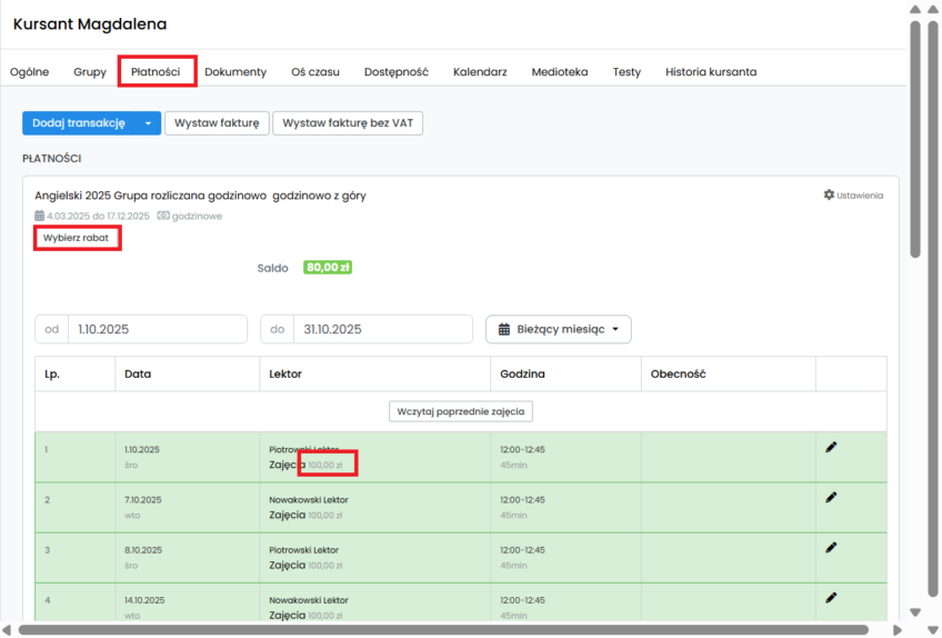Dodanie rabatu kursantowi, który rozliczany jest godzinowo z góry