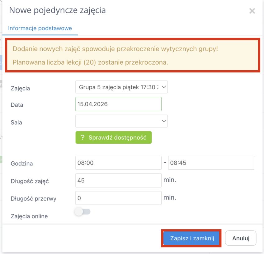 Bez względu na to, który sposób wybierzesz, pojawi się nowe okno. Wprowadź typ zajęć, datę zajęć i ich godzinę, wybierz salę, w której poprowadzisz zajęcia. Jeżeli nie wiesz, którą salę wybrać, skorzystaj z opcji sprawdzania dostępności sal. Wprowadź godzinę rozpoczęcia zajęć i długość jej trwania. Możesz podać „Długość przerwy” lecz jest to jedynie informacja. Możesz też od razu zaznaczyć, czy zajęcia będą dostępne online. Jeśli dodanie zajęć spowoduje przekroczenie wytycznych grupy, na górze okna pojawi się odpowiednie powiadomienie. Po ukończeniu, zapisz zmiany.