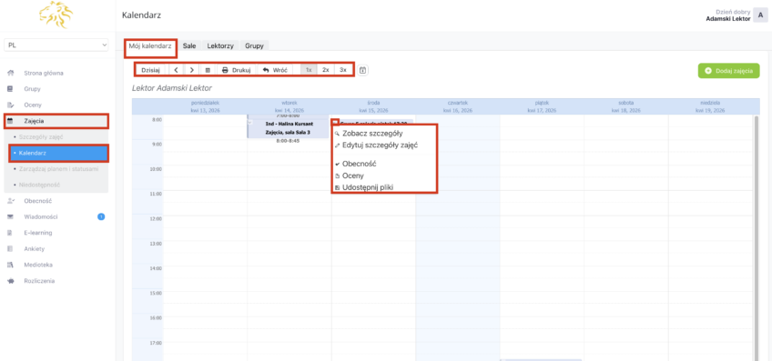 W części „Kalendarz” dostępny jest Twój plan zajęć. Z tego miejsca możesz dodać nowe zajęcia oraz klikając na konkretne zajęcia wykonać takie same czynności jak z poziomu zakładki „Szczegóły zajęć”, czyli zobaczyć i edytować/dodać szczegóły zajęć, sprawdzić obecność, wprowadzić oceny i udostępnić pliki.