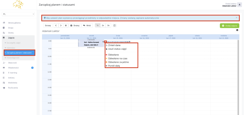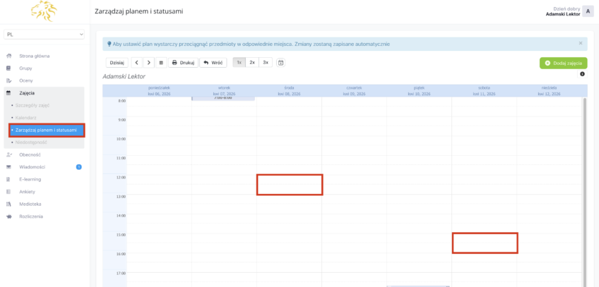 - Przejdź do zakładki Zajęcia i Zarządzaj planem i statusami a następnie kliknij na wybrane miejsce na kalendarzu