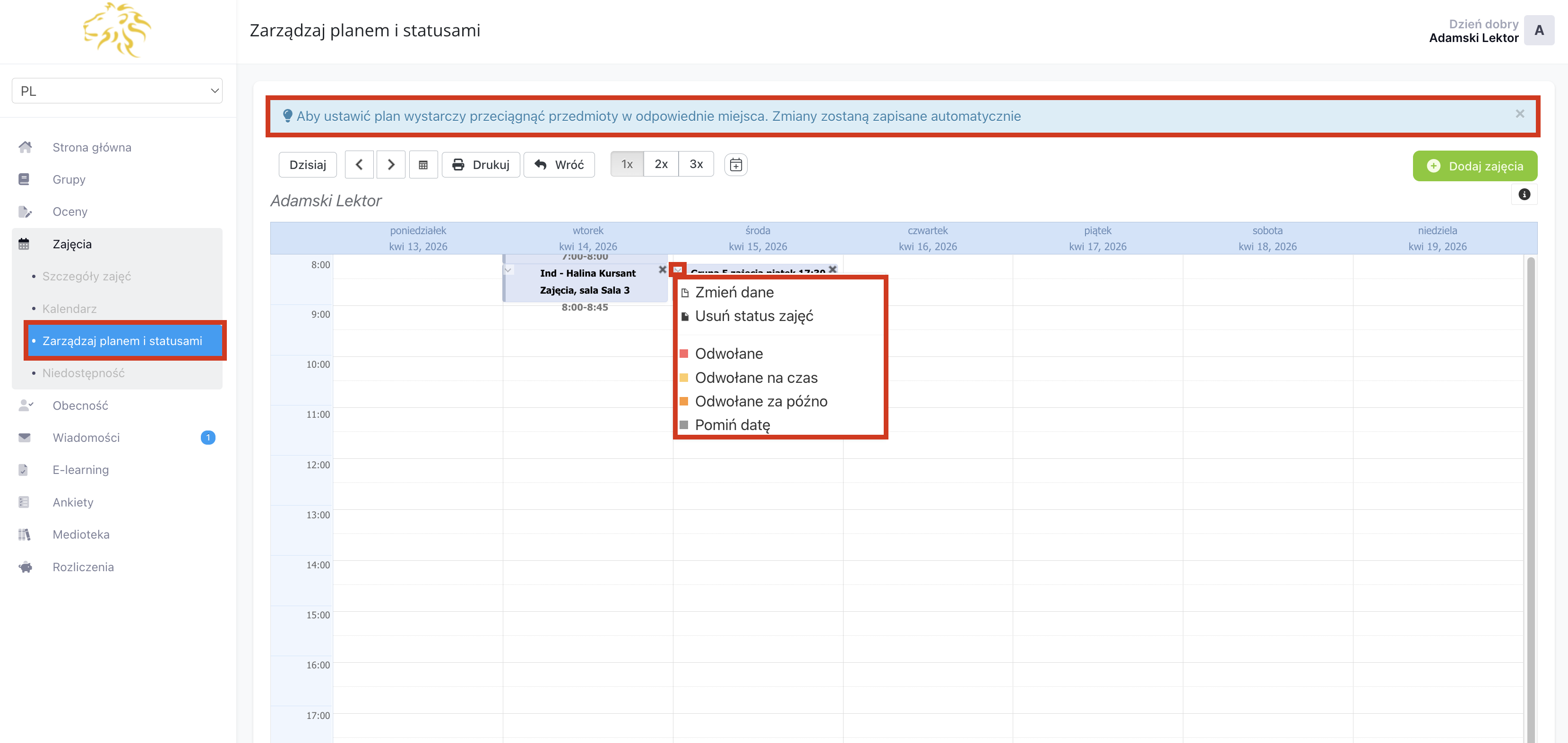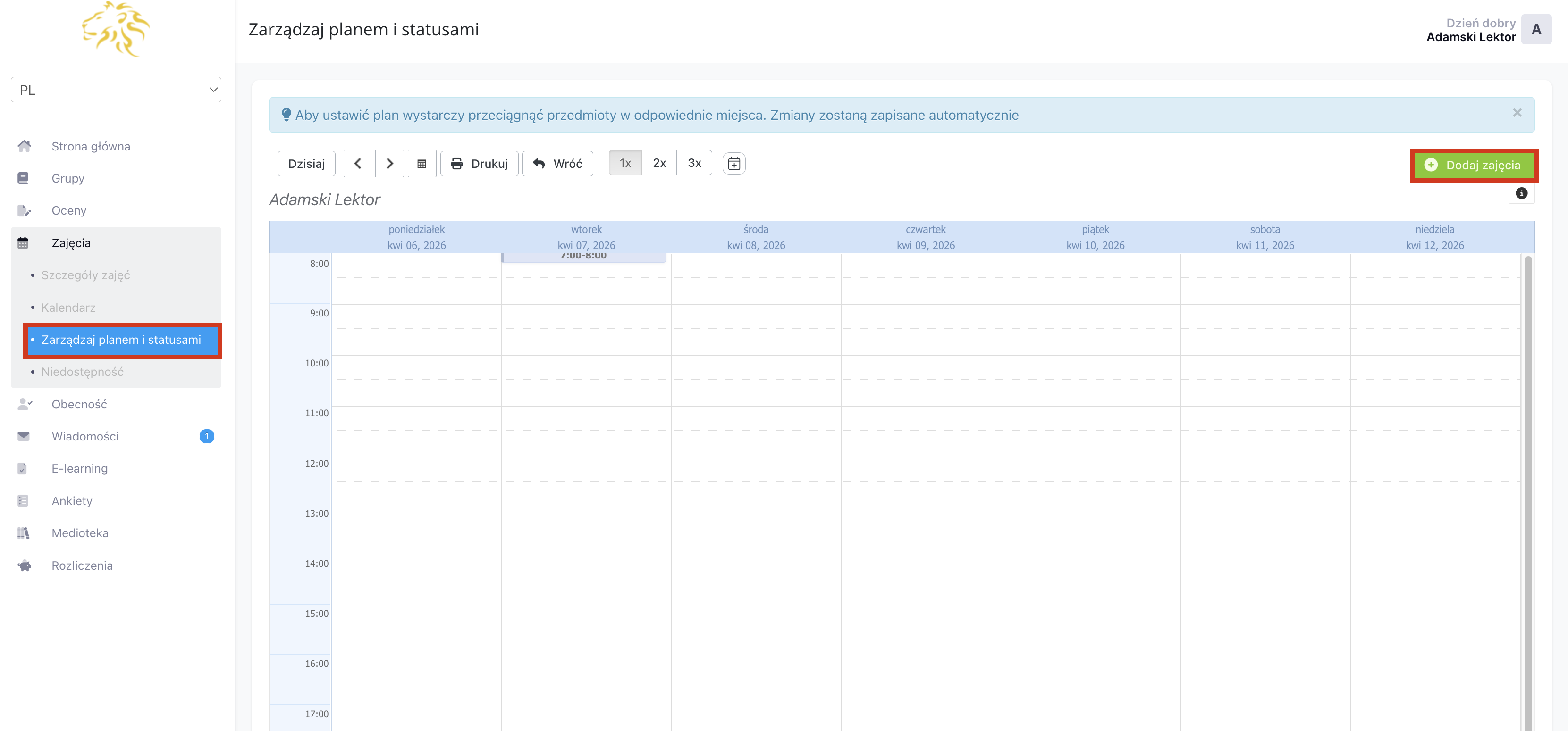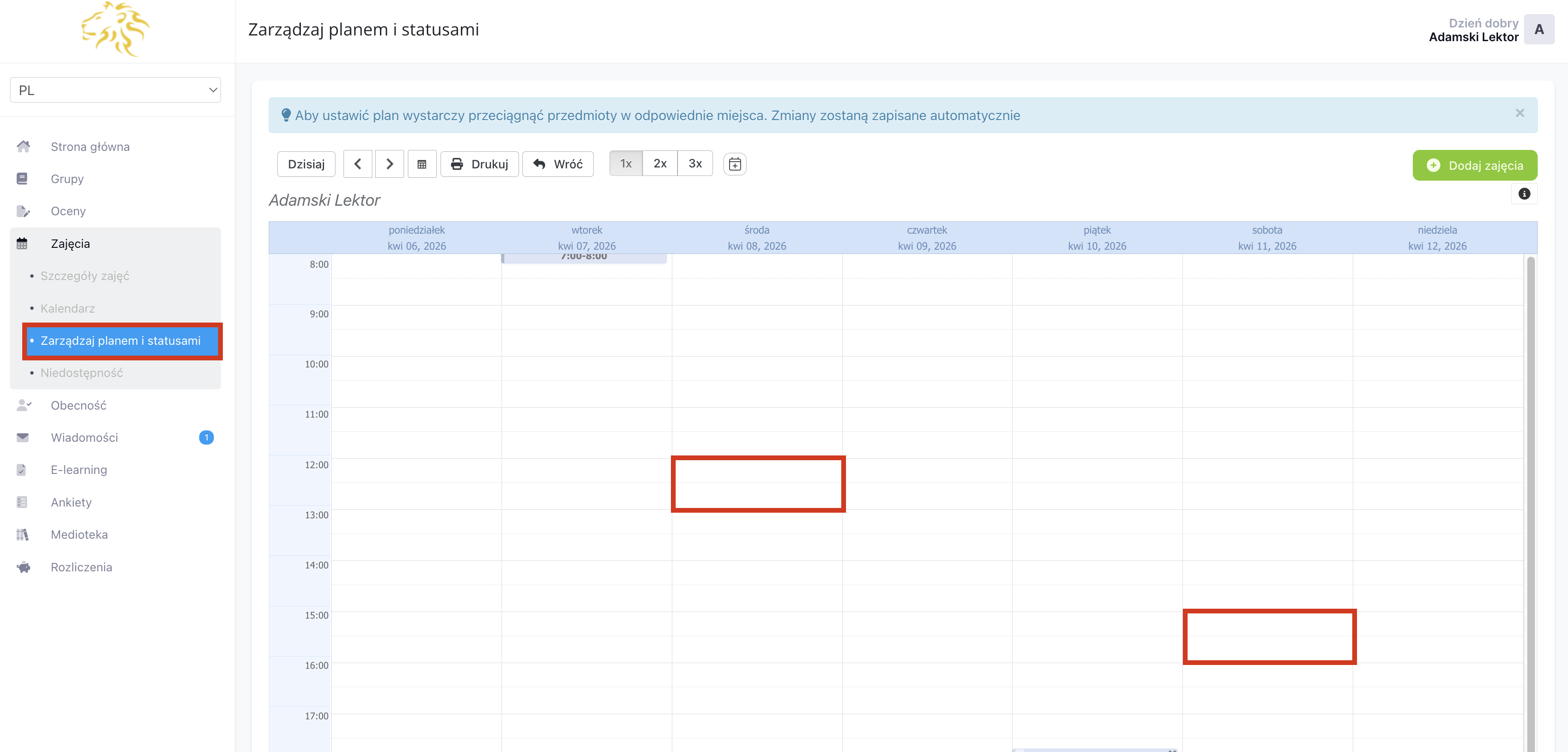 W części „Zarządzaj planem i statusami” znajduje się Twój grafik w widoku tygodniowym. Z tego miejsca możesz dodać nowe zajęcia, nadać status już istniejącym zajęciom oraz zmienić termin zajęć, przeciągając je w odpowiednie miejsce kalendarza.