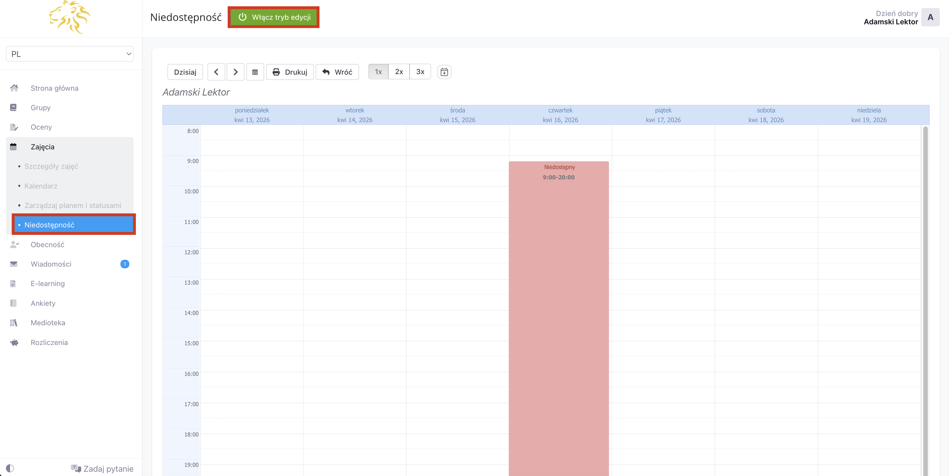 Widok zakładki kalendarza wyświetla plan aktualnego tygodnia. Przyciski „Poprzedni tydzień” i „Następny tydzień” umożliwiają wyświetlanie poprzednich lub kolejnych tygodni kalendarza. Możesz także wybrać interesujący Cię dzień korzystając z kalendarza. Taki plan zajęć możesz wydrukować używając przycisku „Drukuj”.