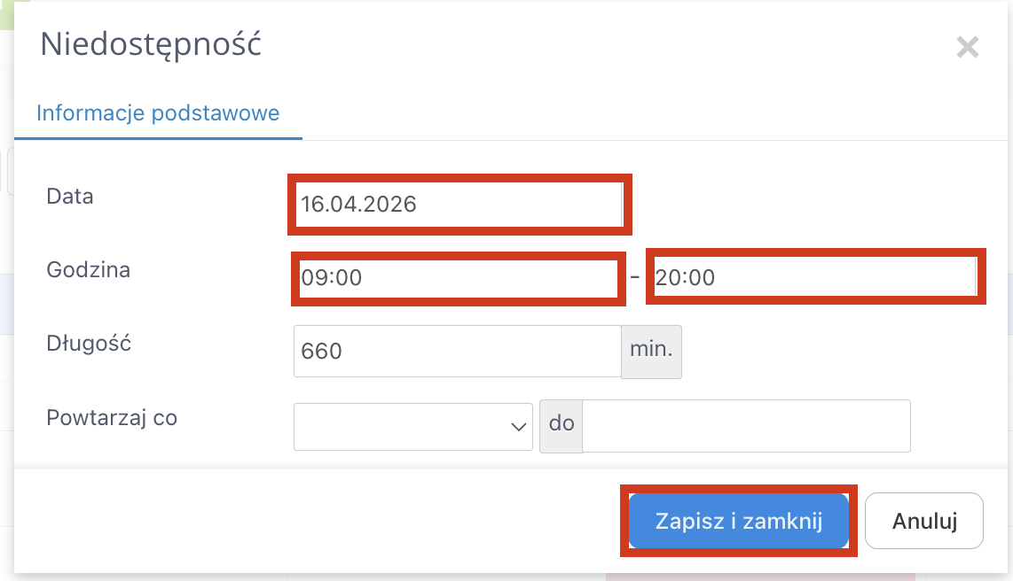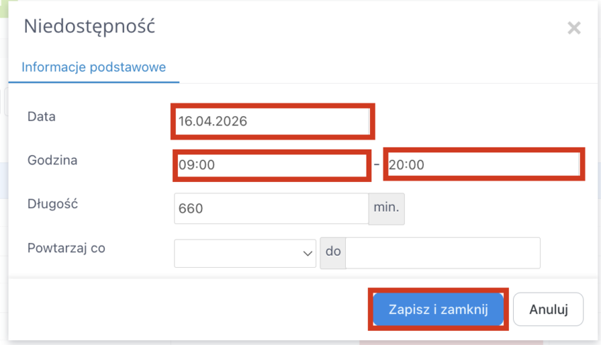 Możesz również ustawić taką niedostępność cyklicznie, aby powtarzała się co tydzień, dwa tygodnie lub miesiąc, wybierając odpowiednią opcję w polu „Powtarzaj co” i wprowadzając datę w polu „do”, do której niedostępność ma być powtarzana.