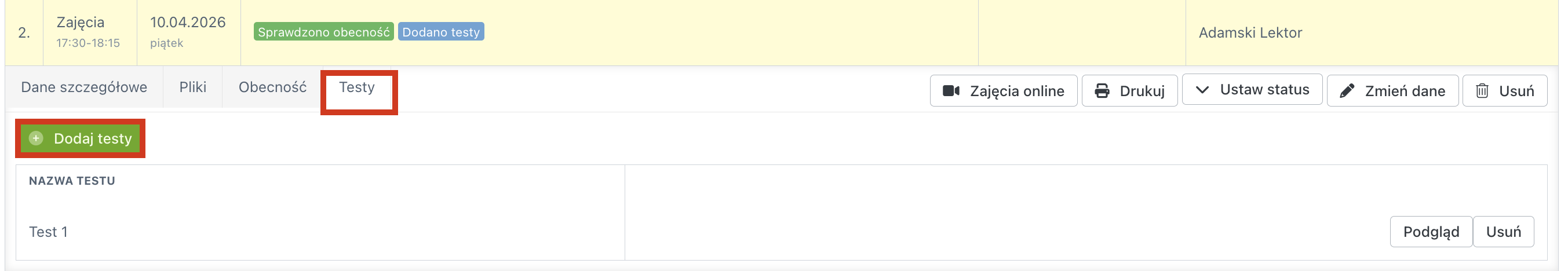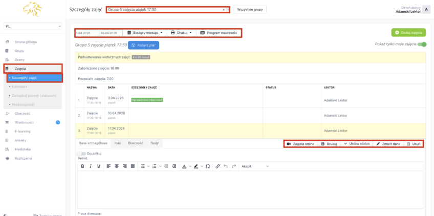 Z poziomu zakładki „Dane szczegółowe” możesz także założyć zajęcia on-line, wydrukować szczegóły zajęć. Po nadaniu odpowiednich uprawnień, możesz nadawać statusy do zajęć, edytować zajęcia zmieniając jej dane, a także usunąć zajęcia z listy.