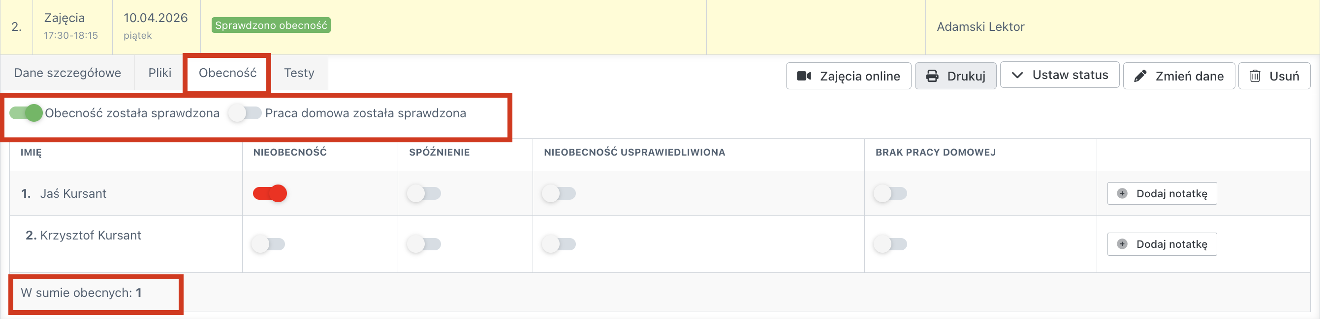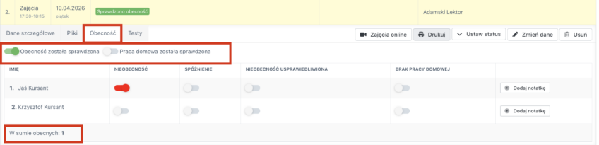 Sprawdź obecność kursantów na zajęciach. W tym celu, przejdź do zakładki „Obecności”. Tu dostępna jest lista kursantów grupy. Zaznacz jedynie te osoby, które nie były obecne na zajęciach. Jeżeli wszyscy byli obecni, kliknij w opcję „Obecność została sprawdzona” , w identyczny sposób możesz zaznaczyć brak pracy domowej.