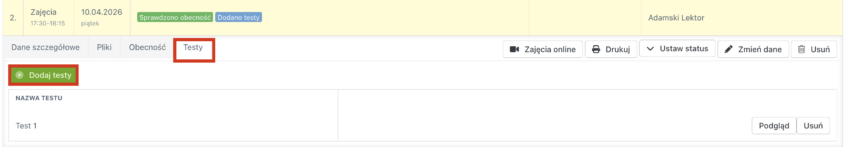 Chcesz sprawdzić poziom wiedzy Twoich kursantów? Dodaj testy do zajęć. W tym celu przejdź do zakładki „Testy” i kliknij „Dodaj testy”. Wybierz jeden z utworzonych testów i kliknij „Dodaj”.