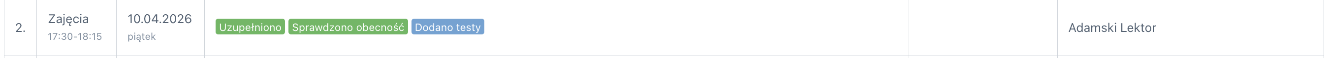 Po uzupełnieniu wybranych zajęć o dowolne informacje, na belce z wybranymi zajęciami pojawi się specjalny status, „Uzupełniono”, „Sprawdzono obecność”, „Dodano pliki” lub „Dodano testy”.