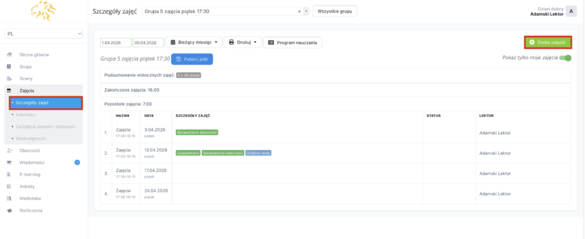 - Przejdź do zakładki Zajęcia i Szczegóły zajęć a następnie kliknij przycisk „Dodaj zajęcia”