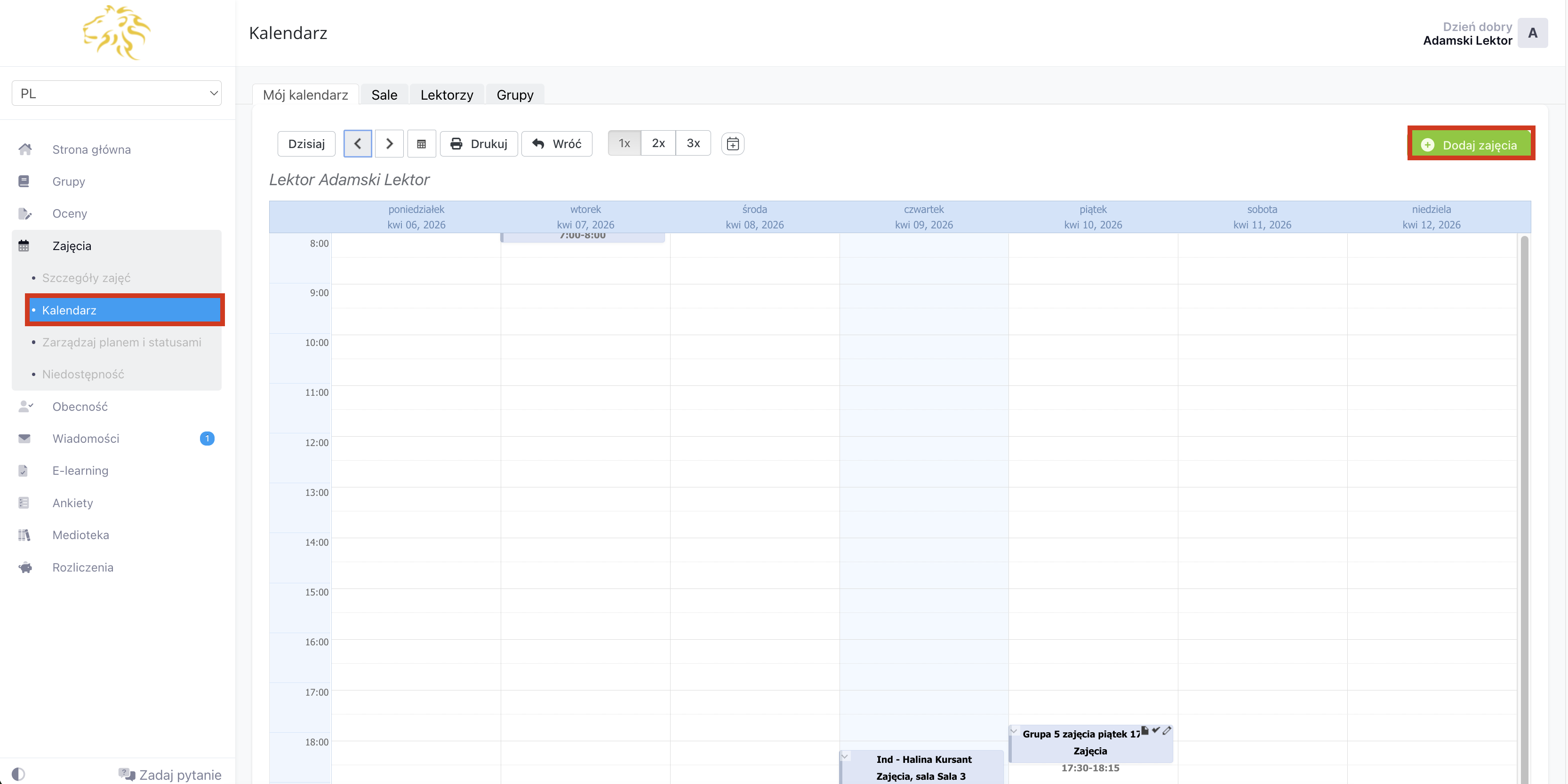 Jeśli posiadasz nadane odpowiednie uprawnienia, to w zakładce „Sale” zobaczysz również grafik sal, w zakładce „Lektorzy” plan zajęć wszystkich lektorów i w zakładce „Grupy”grafik grup.