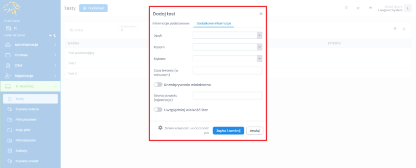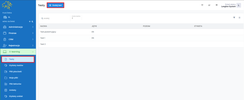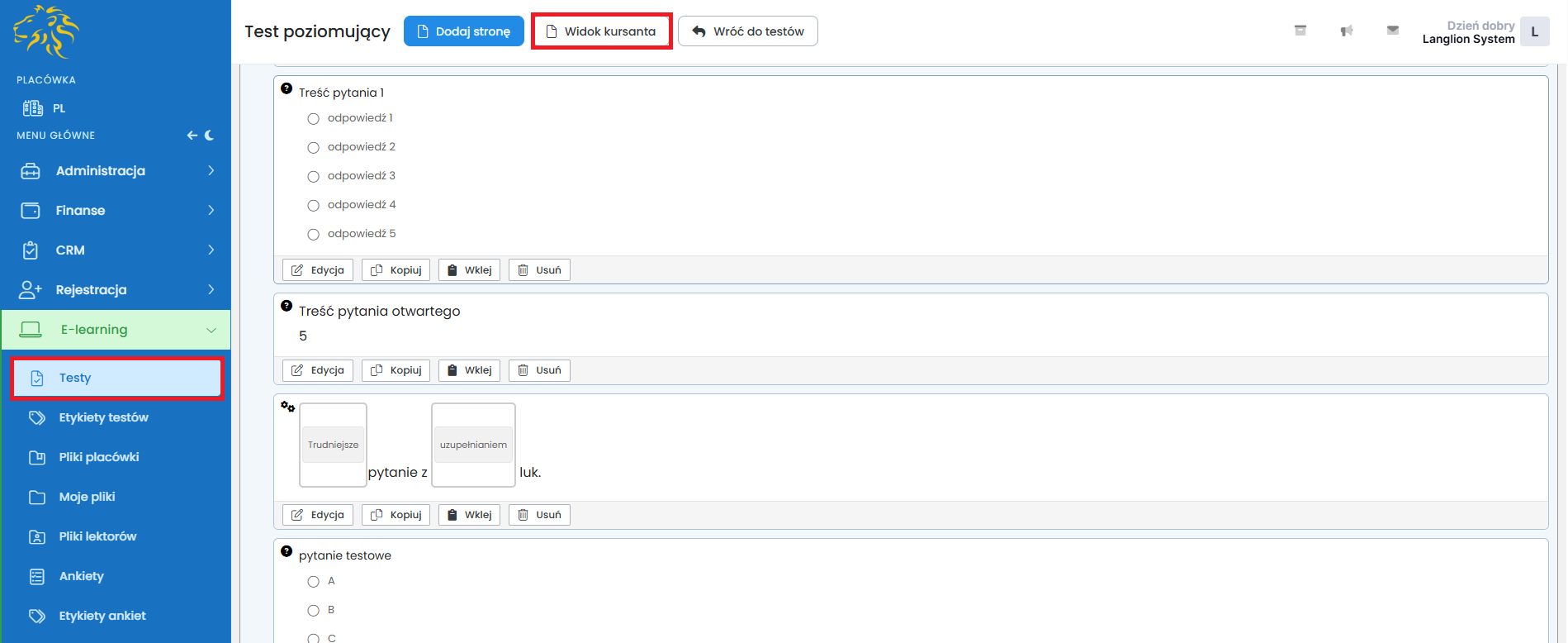 Skorzystaj z możliwości tworzenia testów w Platformie LangLion. Dzięki tej funkcjonalności możesz w łatwy sposób utworzyć test i udostępnić go lektorom, a także kursantom w grupach. Jeżeli prowadzisz zapisy on-line, możesz przypiąć test jako test poziomujący w formularzu rejestracji. Test może składać się z różnego rodzaju pytań – jednokrotnego wyboru, wielokrotnego wyboru, z uzupełnianiem luk, z predefiniowanymi odpowiedziami, a także może zawierać on pytania otwarte i zawierające nagranie z serwisu YouTube.
