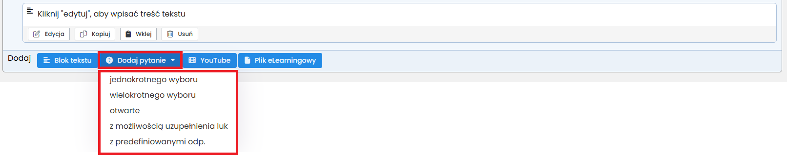 10. Klikając „Dodaj pytanie” wybierz pytanie z uzupełnianiem luk. Rozwiązując je, kursant będzie musiał wpisać brakujący wyraz w zdaniu lub cześć zdania.