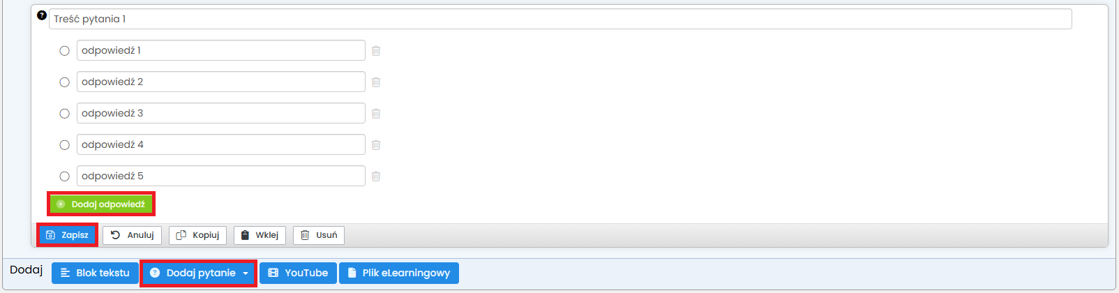 7. Przejdź do utworzenia kolejnego pytania i w tym celu kliknij w „Dodaj pytanie”.