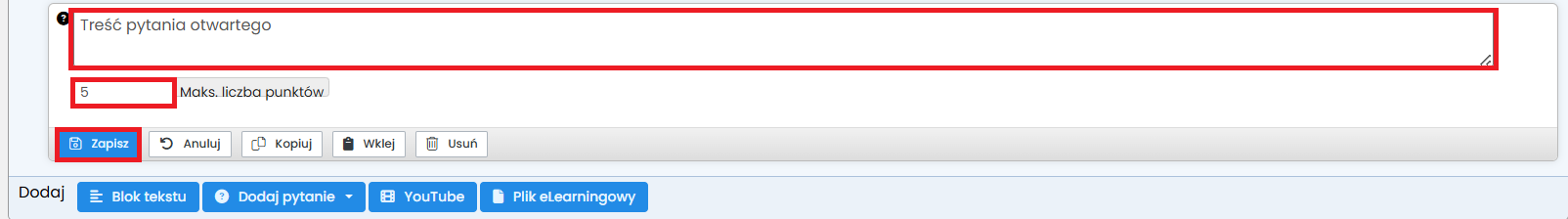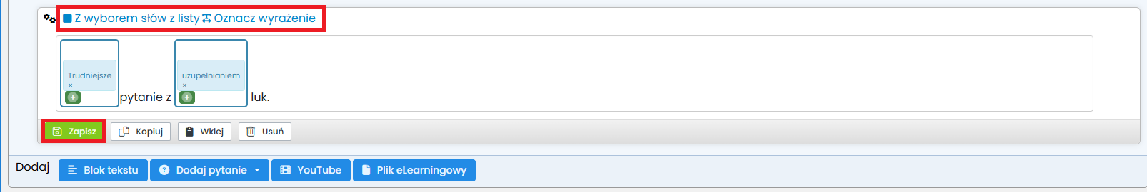 - wpisz treść pytania i zaznacz tekst, w którego miejscu ma powstać luka. Będzie to oczekiwane wyrażenie, które kursant będzie musiał wpisać w lukę.