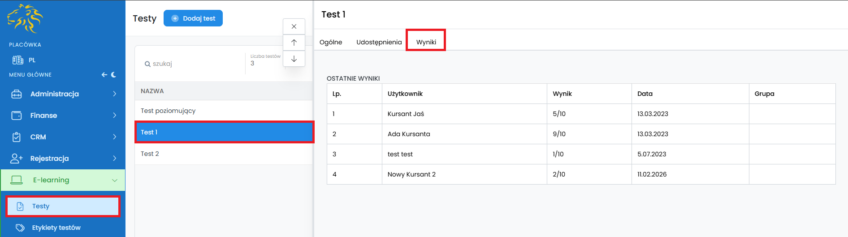 W zakładce „Wyniki” możesz wyświetlić osiągnięcia kursantów, którzy rozwiązali dany test.