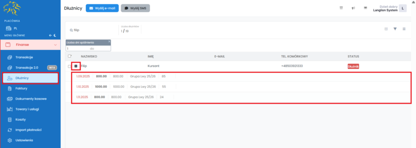 Jeśli chcesz sprawdzić szczegóły należności, kliknij w ikonę + przy nazwisku kursanta